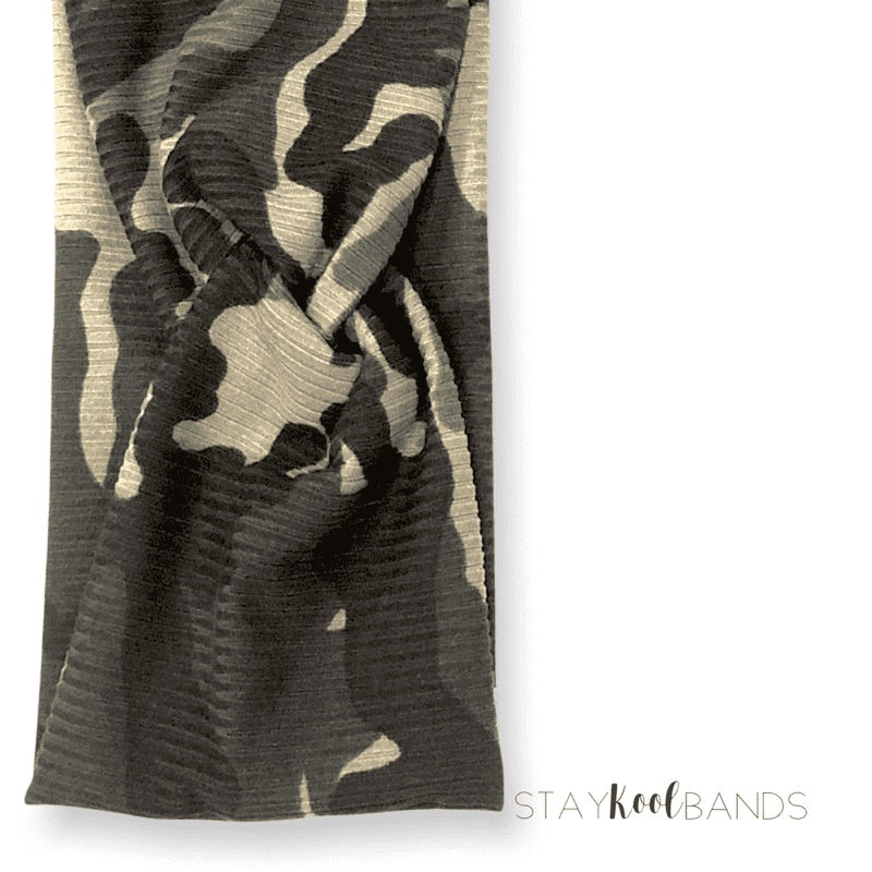 A sewn headband with a super soft and stretchy rib knit fabric. Allover green camo...