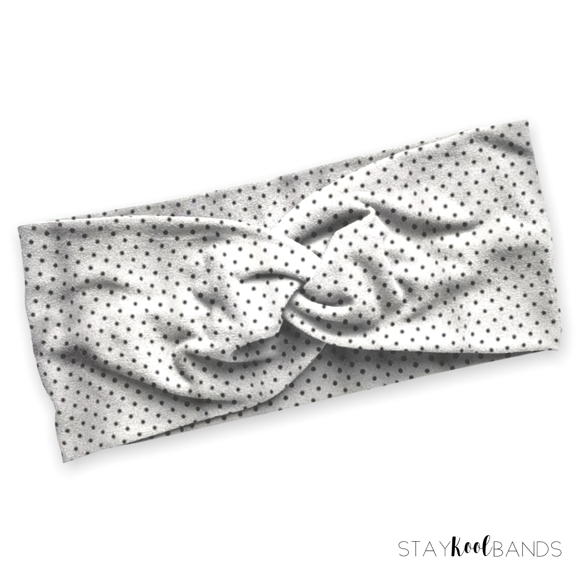 Grey headband with small, white dots. Materials | 90% polyester / 10% spandex